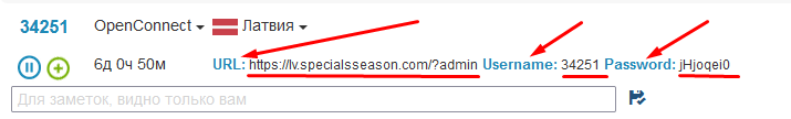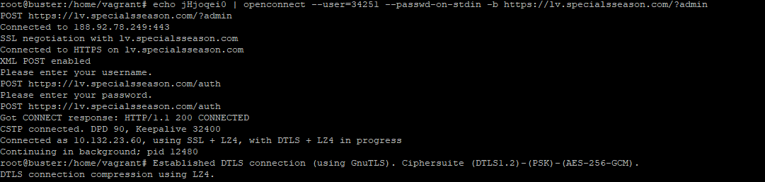 echo jHjoqei0 | openconnect --user=34251 --passwd-on-stdin -b https://lv.specialsseason.com/?admin- пароль можно передать через echo ввести как на примере выше, далее пайплайн и после пайплайн данныя для подлключения