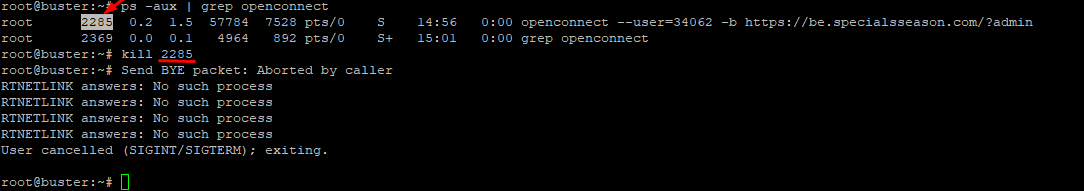 - kill 2285 openconnect Завершен.